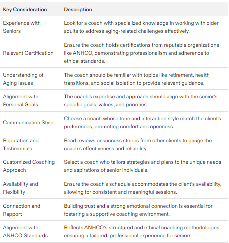 Look for coaches who specialize in working with older adults and have experience with issues related to aging.