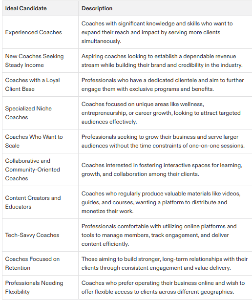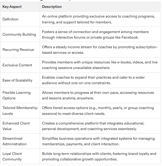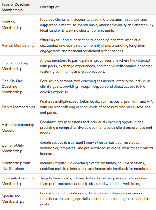 Each type of membership offers a unique set of benefits and features, and can be tailored to meet the specific needs and goals of the coach and their clients.