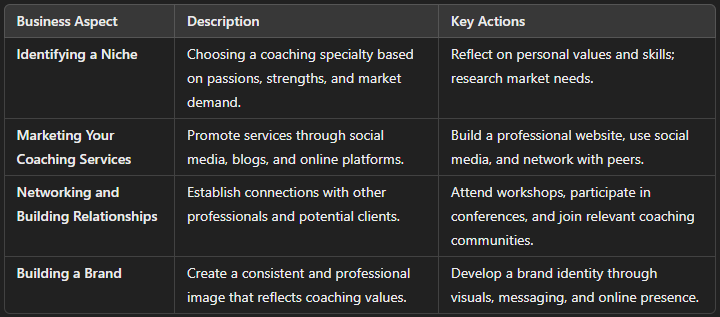 Finally, having a strong business acumen and the ability to market yourself effectively is key to building a successful coaching practice. This may involve creating a professional website, networking with other professionals, and developing a comprehensive marketing strategy.