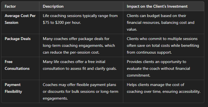 By considering these factors, you can find a life coach who offers the right balance of cost and value, helping you make meaningful progress towards your personal and professional goals.