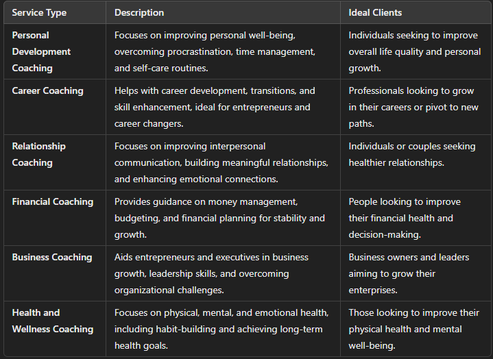 Life coaching services cater to various aspects of life, including health, business, and relationships.