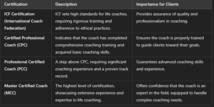 International Coach Federation (ICF) Certification: The ICF is a globally recognized organization that sets high standards for coaching. Coaches with ICF certification have undergone rigorous training and adhere to a strict code of ethics.