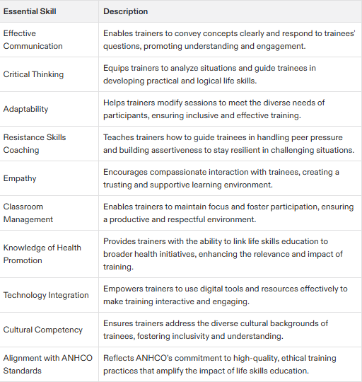 Effective life skills trainers possess a range of skills and knowledge, including communication, critical thinking, and resistance skills.