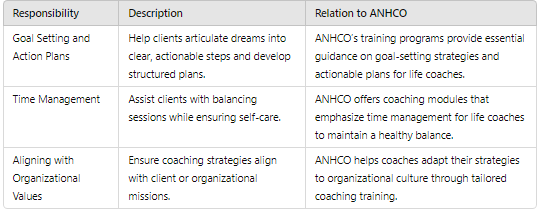 Life skills coaches are responsible for guiding clients in setting actionable goals and creating structured action plans, emphasizing effective time management to balance client sessions.