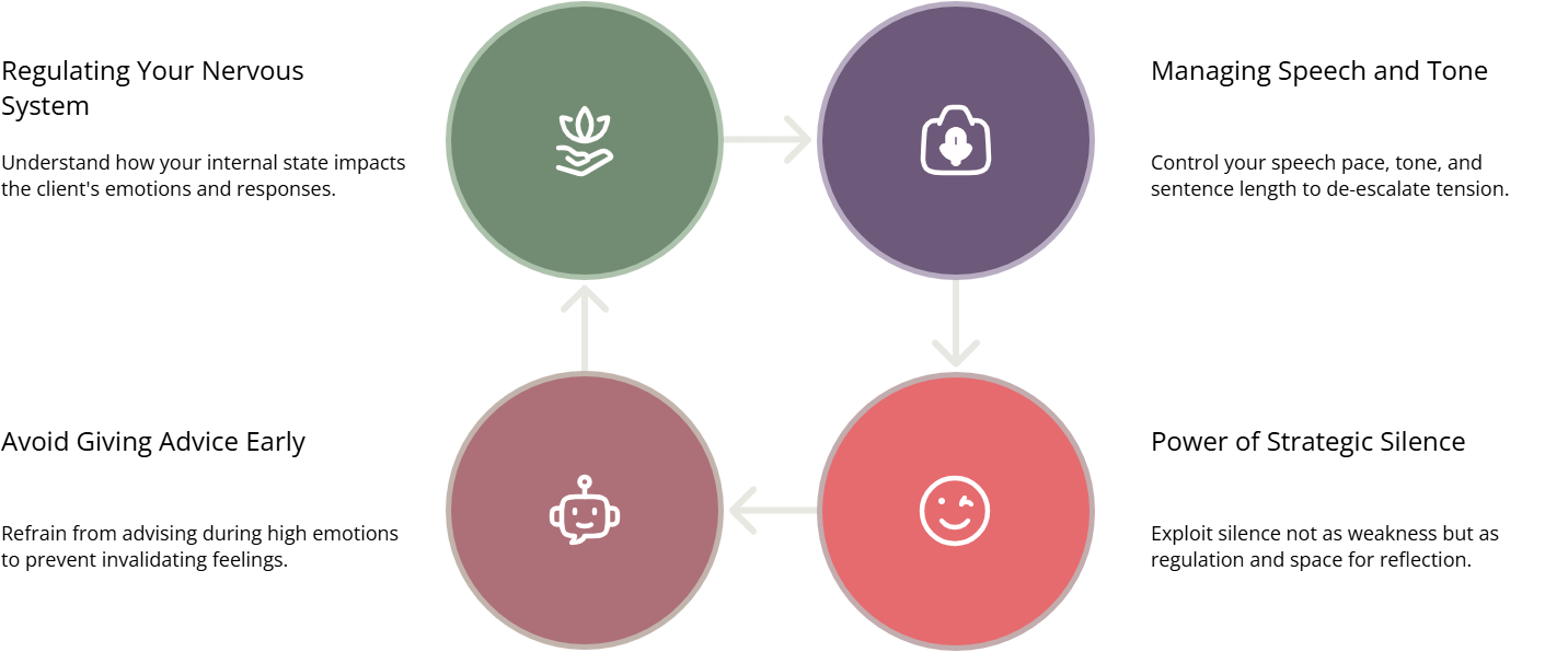 Your nervous system leads the room. If you escalate internally, clients feel it immediately. The fastest way to regain control is to slow the pace of speech, lower your voice slightly, and shorten sentences. Silence is not weakness. Silence is regulation.