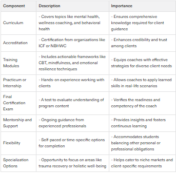 Look for programs that are accredited by reputable organizations, such as the International Coach Federation (ICF) or the National Board for Certified Counselors (NBCC). Some programs may also offer master coach training as an advanced step for those looking to further specialize in mental health coaching.
