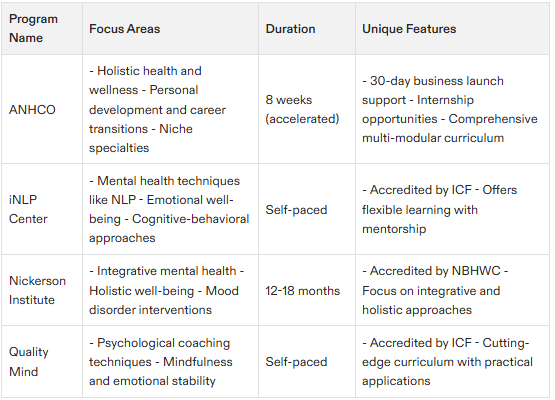 Consider programs that offer a comprehensive curriculum that covers topics such as mental health, wellness coaching, and behavioral health.
