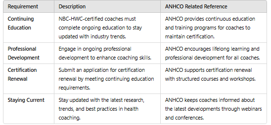 As a National Board Certified Health & Wellness Coach (NBC-HWC), it is essential to maintain certification and stay current with the latest research and best practices in the field. The National Board for Health & Wellness Coaching (NBHWC) requires certified coaches to complete continuing education requirements to maintain their certification. This ensures that NBC-HWCs stay up-to-date with the latest developments in health and wellness coaching and can provide the highest level of service to their clients.