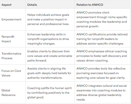 Coaching can also help nonprofit organizations develop a sense of purpose and meaning, and make a positive impact in the world.