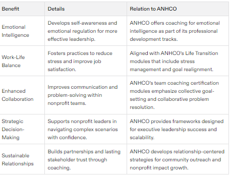 Coaching can help nonprofit leaders develop emotional intelligence, strategic planning, and leadership skills.
