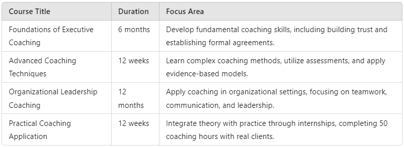 It is essential to match the coaching curriculum with your professional ambitions for career advancement. Courses focusing on organizational coaching are designed to highlight teamwork and proficient communication, providing prospective coaches with critical skills that apply across various workplace environments.