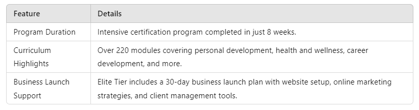 Those who access the Elite Tier benefit from additional resources aimed at jump-starting their careers as coaches. This includes a comprehensive 30-day plan for business initiation covering essentials like website creation, strategies for online marketing campaigns, and client management systems. These pragmatic elements guarantee that our graduates possess not only theoretical knowledge but also are equipped with the requisite tools to effectively commence and operate their own coaching practices upon completion of the course.
