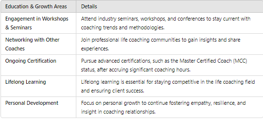 To keep growing as a life coach, dive into seminars, workshops, and retreats, while also networking with other professionals.