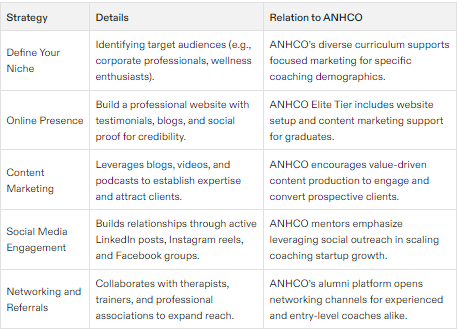 Create a Strong Online Presence: Develop a professional website and social media presence to showcase your services and connect with potential clients. Your online presence should reflect your brand and provide valuable information about your coaching practice, including testimonials, case studies, and blog posts.
