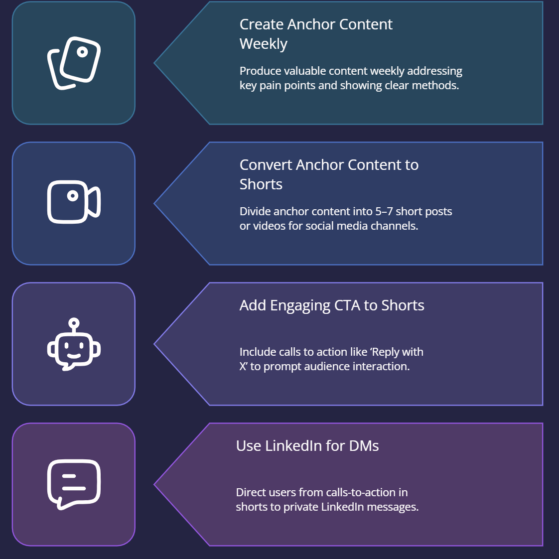 Skip random posting. Use a single, standardized spine: weekly anchor content → 5–7 shorts → LinkedIn DMs → triage → call. Anchor pieces should answer a specific pain with a visible method. In each short, add a “reply with X” line to trigger DMs; route everyone to the same two qualifiers and a 3-minute form. For platform mechanics and message structure, follow LinkedIn expansion so discovery turns into booked calls.