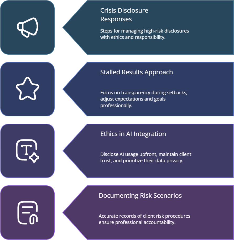 When a client discloses risk (self-harm, abuse, imminent danger): pause coaching aims, review consent exceptions, initiate your crisis pathway (local hotlines, emergency contacts, professional referrals). Document time, content, actions, and outcomes. Follow with an Ethics Debrief email summarizing steps—store it securely and reference your resource library for supportive materials.