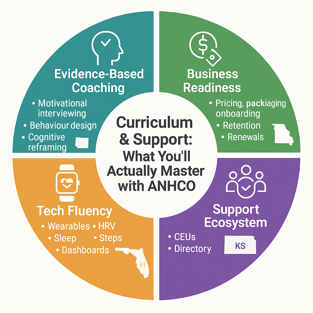 1) Pick an accredited, outcomes-first program. Choose ANHCO so your credential is portable into neighboring markets while matching standards now common from California to Florida. Confirm curriculum depth—ethics, scope, behavior science, coaching labs, and business mechanics.