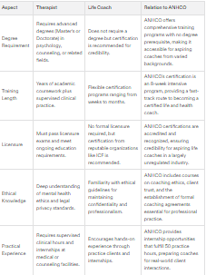 Therapists require extensive education and clinical training, while life coaches follow more flexible pathways for certification.