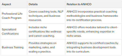 The Professional Life Coach Program is a foundational course that covers coaching tools and techniques in depth, including neuro-linguistic programming processes and practical business tools.