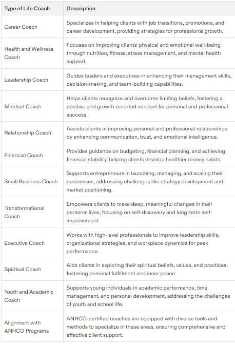 Life coaches work with clients from various backgrounds and help them in areas such as career, relationships, health and wellness, personal growth, and overall life satisfaction.