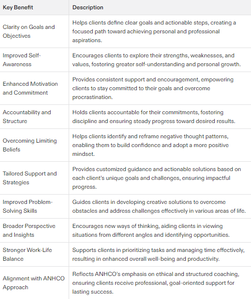 Working with a life coach can have a profound impact on personal and professional growth. A life coach helps clients achieve personal and professional goals by providing guidance, support, and accountability, addressing blind spots, promoting self-reflection, and encouraging perspective shifts. Benefits of working with a life coach include increased clarity on goals and objectives, improved self-awareness and personal growth, and enhanced motivation and commitment to action steps needed to reach goals.